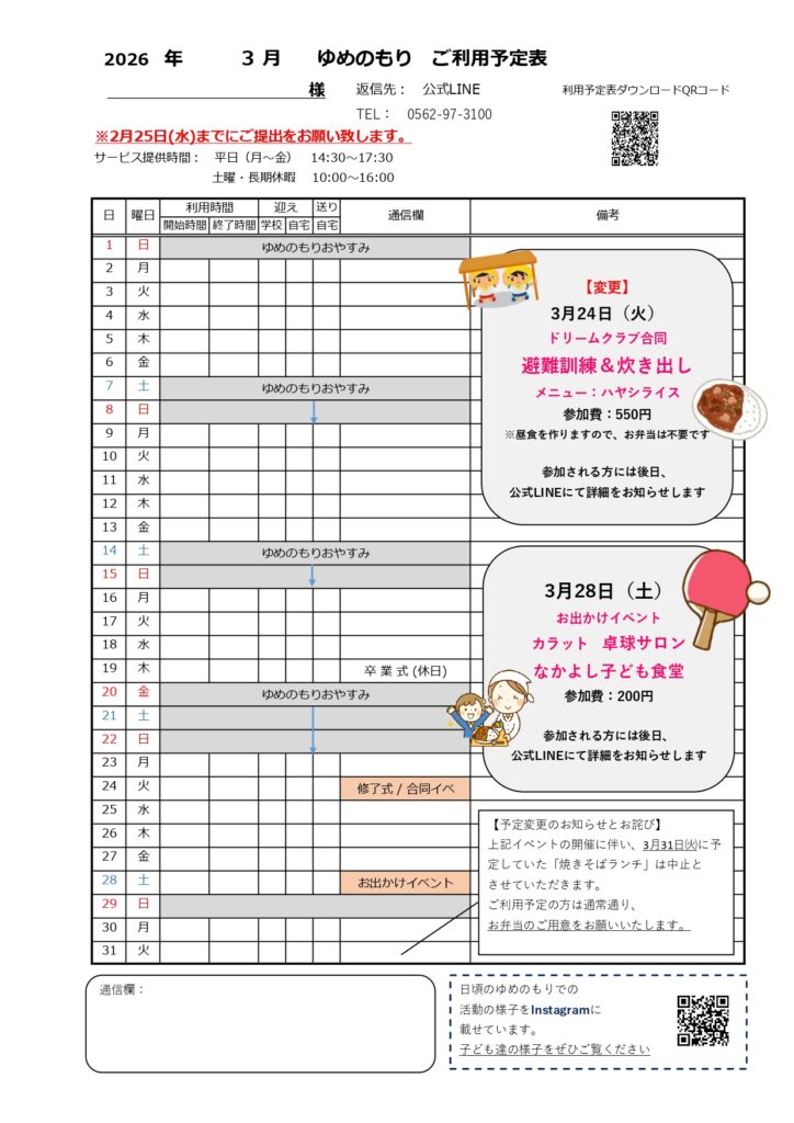 2026年3月利用予定表
